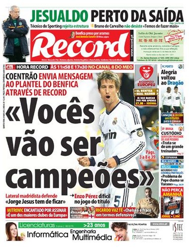 Fábio Coentrão, vestido de branco, não conseguiu ser campeão em Espanha. Mas procurou compensar o fracasso empurrando para o pódio os que por cá trajam de encarnado. Em vez de bola, serviu-se de palavras. Demonstrando assim que é mais hábil com os pés do que com a língua: a frase dele que serviu para a garrafal manchete do Record de 8 de Maio pode ter acertado em cheio, mas equivocou-se na data: este ano, em matéria de troféus, a Luz ficou às escuras.