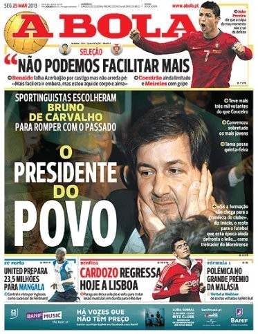 Neste mesmo dia o diário A Bola dedicava a manchete ao novo líder leonino. Chamando-lhe "Presidente do Povo". E ficávamos a saber que o primeiro acto de Bruno de Carvalho, ainda antes da posse, foi ter assegurado a Jesualdo Ferreira que contava com ele para orientar a equipa principal de futebol nas sete jornadas que sobravam da Liga 2012/13. Quando o Sporting seguia em décimo lugar na tabela classificativa.