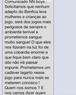 Mão amiga fez-me chegar este suposto comunicado dos NN. Como não vejo logos, assinaturas, quero acreditar que é uma brincadeira de muito mau gosto e que não é de todo verdade. Triste seria que um jogo de saudável rivalidade entre nós e o clube com nome de bairro ficasse estragado por alguns idiotas sem cérebro que, infelizmente, há em todos os clubes...