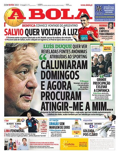 Como hoje é dia de jogo com o Paços de Ferreira, na estreia de Ricardo Sá Pinto perante o seu público, o jornal A Bola brinda os seus leitores lampiões com informação paralela ao encontro. Em vez das declarações do técnico leonino sobre a partida, de novidades sobre o onze ou de alguma notícia relevante e bombástica, eis o "caso Domingos" de volta. Digam-me lá, desencantar este assunto agora interessa a quem?